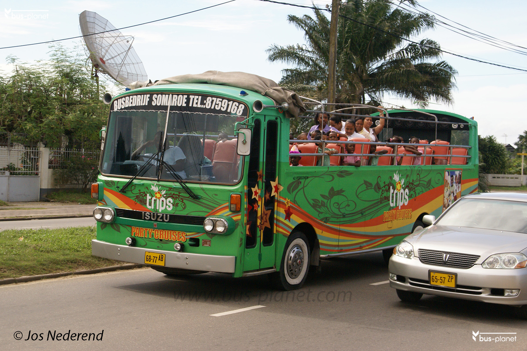 This bus company primarily operates party buses. These buses have a diverse range of origins. For example, there’s a DAF/Smit, which originated in the Netherlands with GADO. Buses were also acquired from neighboring French Guiana, and there are also buses of American and Japanese origin. The partybuses are touringcars converted into open-top buses. They can be rented for parties. Passengers then travel, as they say in Suriname, “bussen”. The company is located in the Houttuinen project, one of the suburbs of Paramaribo, in the Wanica district.